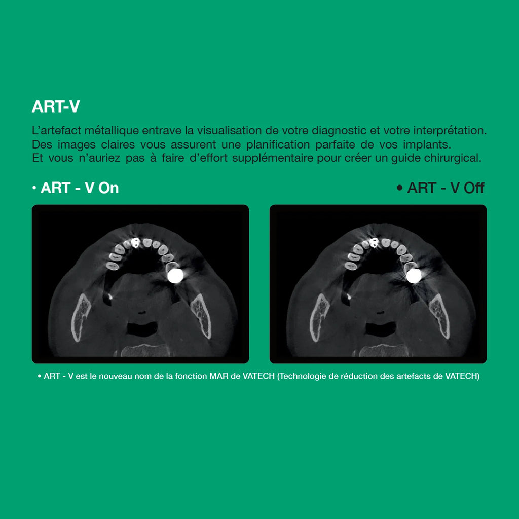 Le Green 2 utilise la technologie ART-V (Metal Artifact Reduction) pour éliminer les artefacts métalliques, garantissant ainsi une meilleure qualité d’image et une planification implantaire optimale sans interférences.